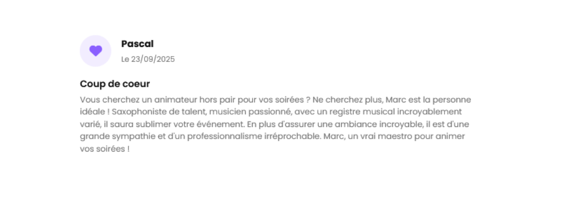 Super soirée!!! Encore un grand bravo à vous deux!!! je recommande ce duo de Dj chanteuse et saxophone.